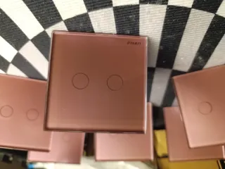 Conjunto de ocho interruptores dobles con un elegante diseño en acabado rosa. Precio por lote completo Ref 7-8-9-10-11-12-13-14 - Diseño moderno y minimalista. - Acabado en color rosa. - Cada interruptor es doble.