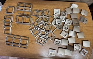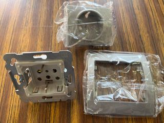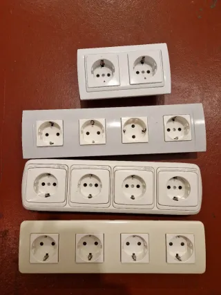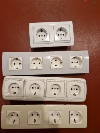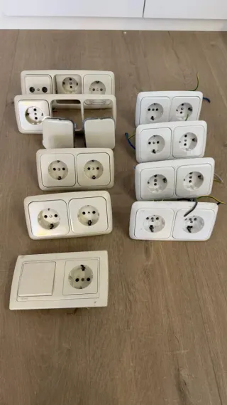Por reforma se vende lote variado de enchufes e interruptores de una vivienda. - 8 Enchufes sencillos completos + 8 cerquillos. - 7 Enchufes de fuerza completos en carcasa indivudual + 4 cerquillos - 11 Interruptores de un botón completos + 2 cerquillos - 4 Interruptores dobles completos + 4 cerquillos. - 1 carcasa rectangular que incluye un enchufe de fuerza, un pasacable y una tapa sin conexión. - 1 carcasa rectangular que incluye dos enchufes de fuerza y cerquillo. - 1 carcas rectangular que incluye tres interruptore, una tapa sin conexión y cerquillo. - 7 unidades de enchufes e interruptores desparejados o incompletos. .