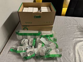 Lote de mecanismos Unica de Schneider Electric. - Mecanismos de superficie. - Color blanco. -3 cajas superficie dobles -3 cajas superficie simple -3 marcos dobles -3 marcos simples -4 enchufes -3 interruptores anchos -1 interruptor estecho -9 bastidores