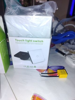 En venta, artículos eléctricos son nuevos sin uso. - Tres interruptores de luz blancos. - Un enchufe eléctrico blanco. - Un cable eléctrico con tres hilos de colores.
