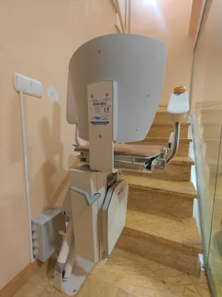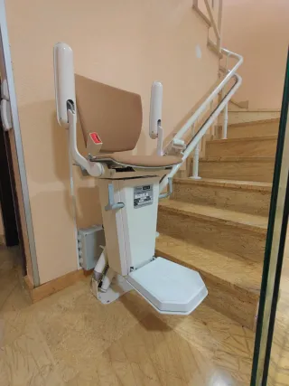 Silla salvaescaleras diseñada para tramos de escalera curvos. Su asiento es de color beige y cuenta con reposabrazos. En perfecto funcionamiento. Se vende por compra de casa con la silla incluida. La guía está dividida en tres tramos, por lo que podría ser adaptable Incluye dos baterías internas recien cambiadas. - Asiento de color beige. - Reposabrazos. - Cinturón de seguridad. - Hasta 125Kg. - Dos interruptores para petición de subida/bajada de silla. - Transformador y caja de registro incluidos - Fijaciones al suelo firmes - Negociable Pidan más información sin compromiso. Se Puede quedar para ver la silla en funcionamiento