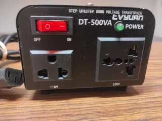 Transformador de voltaje EVYUAN DT-500VA, apto para subir y bajar voltaje. - Modelo: DT-500VA - Tipo: Step Up & Step Down Voltage Transformer - Indicador de encendido LED verde - Interruptor ON/OFF - Tomas de corriente universales para 110V y 230V