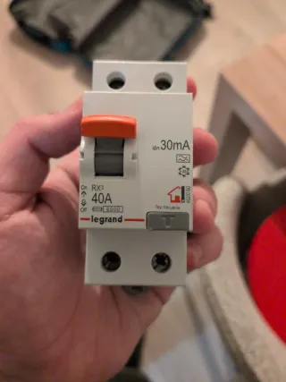 Interruptor diferencial de la marca Legrand. - Modelo RX3. - Intensidad nominal: 40A. - Sensibilidad: 30mA. - Tensión de aislamiento: 6000. - Test: frecuente.
