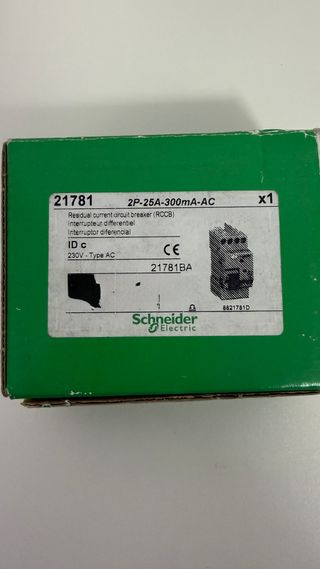 Lote de cinco interruptores diferenciales Schneider Electric. - Modelo: 21781 - Tipo: 2P-25A-300mA-AC - Tensión: 230V - Clase: AC - Referencia: 21781BA