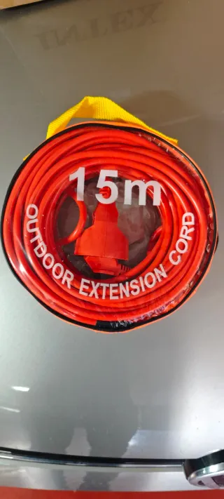 Alargador de cable de 15 metros, ideal para uso en exteriores. El cable es de color naranja brillante y viene guardado en una bolsa de transporte. - Longitud: 15 metros. - Color: Naranja. - Apto para exteriores. - Incluye bolsa de almacenamiento.