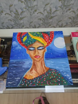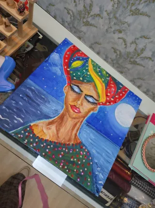 Pintura original de una mujer con turbante colorido, sobre un fondo de mar y luna. - Técnica mixta con detalles brillantes. - Tonos vibrantes y llamativos. - Representación artística única.