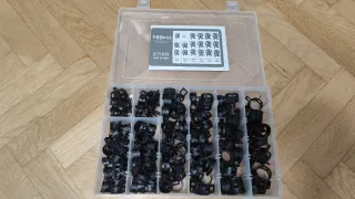 Set de 150 abrazaderas para manguera, con un rango de tamaño de 15 a 22 mm. Vienen organizadas en un práctico estuche. - 150 piezas. - Rango de sujeción: 15-22 mm. - Material: Plástico negro.