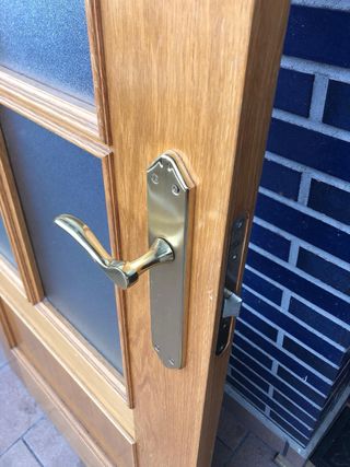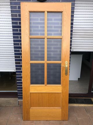 Puerta interior de madera maciza con 6 cristales translúcidos que dejan pasar la luz manteniendo la privacidad. Acabado en tono madera natural, estilo clásico y elegante, ideal para salón, cocina o despacho. Incluye manilla y herrajes (los que se ven en la foto). En buen estado general, sin golpes importantes; solo marcas normales de uso. Cristales en perfecto estado. Se vende por reforma de vivienda. Medidas: 72,5 x 205cm Recogida en mano (no se envía por tamaño). Cualquier duda, pregunta sin compromiso.