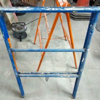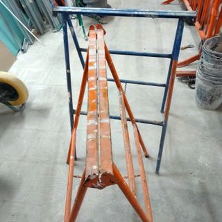 Caballete metálico de obra, ideal para trabajos de construcción o reformas. Su diseño plegable facilita su almacenamiento y transporte. - Estructura robusta de metal. - Color azul con detalles naranjas. -