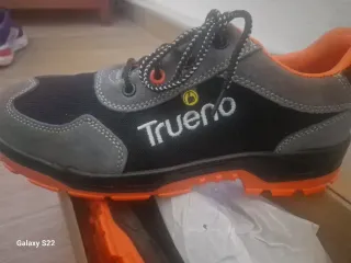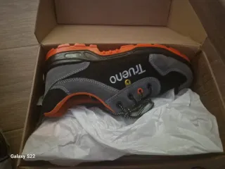 Botas de seguridad de trabajo nuevas, con un diseño moderno y resistente. - Color negro y gris con detalles naranjas. - Cierre con cordones. - Suela de goma antideslizante.