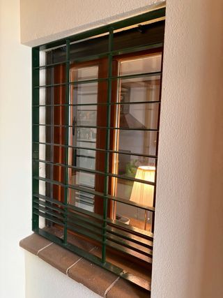 Reja de seguridad metálica para ventanas. Protege tu hogar con este elemento disuasorio. - Color verde oscuro. - Diseño de barras horizontales y verticales.
