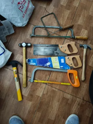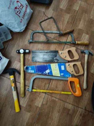 Conjunto de herramientas manuales para trabajos de bricolaje o reparaciones. - Sierra de arco con hoja. - Serrucho de carpintero. - Sierra de mano con mango naranja. - Martillo de bola con mango de madera. - Martillo de uña con mango de madera y detalles amarillos.