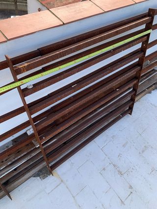Reja metálica con acabado oxidado, ideal para exteriores. - Fabricada en metal resistente. - Diseño de barras horizontales. - Se escucha oferta.