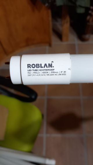 Tubo LED de la marca Roblan. El precio es por unidad. Dispongo de 30 unidades. Si no eres de mi zona puedo hacercarlo a zona Clot de Barcelona. Especificaciones: - Potencia: 9W - Flujo luminoso: 990 Lm - Temperatura de color: 4000K - Longitud: 598mm - Protección: IP 20 - Ángulo: 330° - Factor de potencia: >0,9 - Casquillo: G13 - Voltaje: 185-265V AC - Fabricación: 08/2022