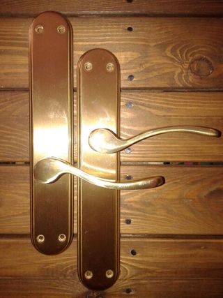 Juego de dos manillas de latón para puertas. Diseño elegante y acabado cromado en dorado. Sin mecanismo interno, solo el embellecedor exterior con la manilla. Dispongo de 11 parejas. El precio es por cada pareja. Si no eres de mi zona puedo hacercarlo a Zona Clot de Barcelona.