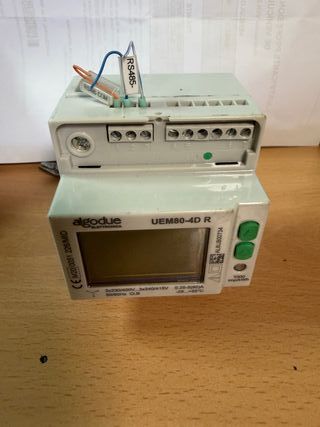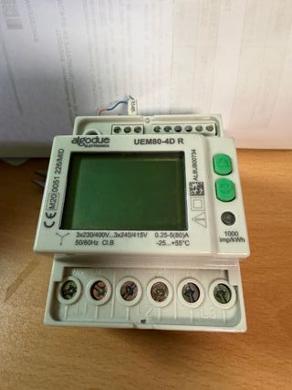 Medidor de energía UEM80-4D R de la marca Algodue. - Modelo: UEM80-4D R - Certificación MID: CE M20 0051 226/MID - Tensión: 3x230/400V...3x240/415V - Corriente: 0.25-5(80)A - Frecuencia: 50/60Hz - Clase de precisión: Cl.B - Rango de temperatura: -25...+55°C - Impulsos: 1000 imp/kWh - Conexión RS485