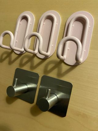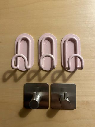 Pack de tres ganchos adhesivos de color rosa. Incluye también dos ganchos metálicos. - Tres ganchos de hierro rosa con forma de U. - Dos ganchos de metal con base cuadrada. No traen los adhesivos para colgar. Se venden todos juntos.