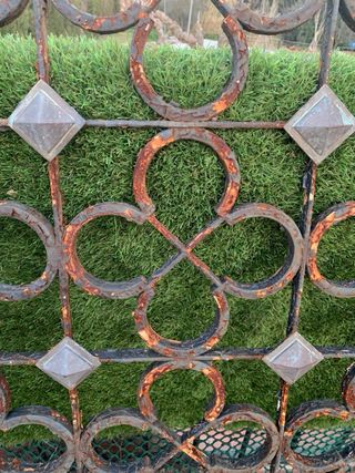 Reja de hierro forjado con un diseño ornamental. - Estructura metálica. - Motivos florales y rombos. Para restaurar
