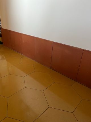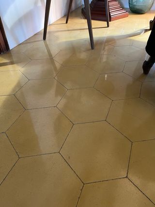 Baldosas hidráulicas de forma hexagonal y color amarillo. Medidas en las fotos. - Años 40-50. - Diseño geométrico. - Acabado mate. Venta por unidades o metro cuadrado, precio a negociar.