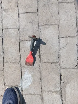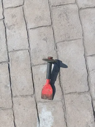 Herramienta de albañilería para trabajos de corte y desbaste. - Mango de goma rojo y negro. - Hoja ancha de metal.