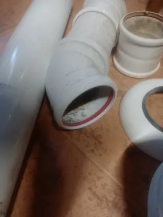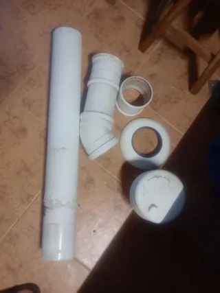 Lote de piezas de fontanería y desagüe. - Un tubo largo blanco. - Un codo de desagüe. - Dos manguitos de unión. - Una pieza circular tipo chimenea. Todo es de aluminio, sacado de la chimenea de la caldera