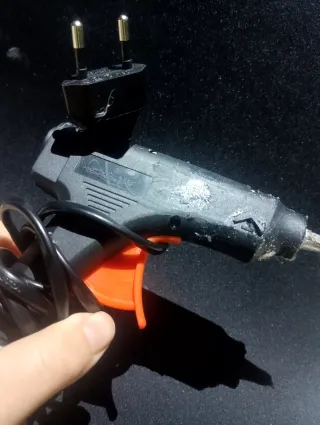 Pistola de silicona con cable y dos barras de pegamento. - Color negro y naranja. - Incluye dos barras de silicona.
