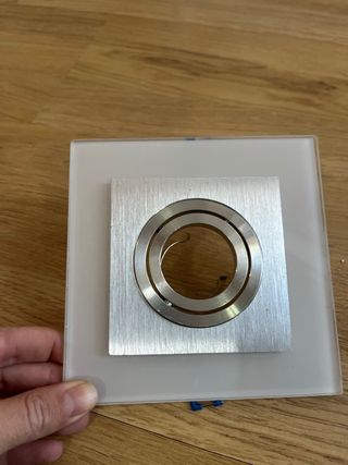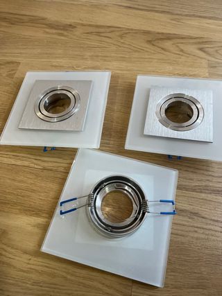 Set de tres embellecedores para focos empotrables. - Diseño cuadrado con acabado en cristal blanco y metal. - Ideales para dar un toque moderno a la iluminación. - Incluyen resortes de sujeción.