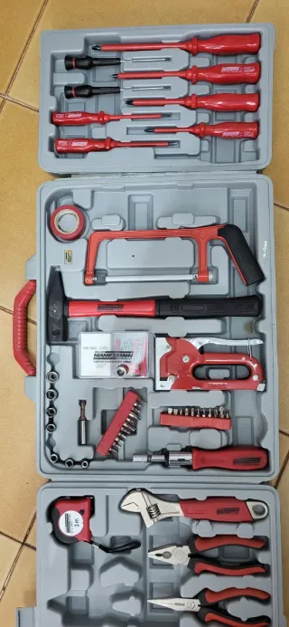 Maletín de herramientas Mannesmann con varios útiles. - Juego de destornilladores aislados. - Sierra de arco. - Martillo. - Grapadora. - Cinta métrica. - Llave inglesa. - Alicates. - Juego de puntas. En la maleta faltan algunas herramientas del juego .