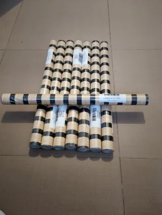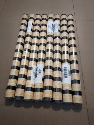 Se venden 8 rollos de papel tapiz con un diseño que imita la madera. Cada rollo tiene un patrón de rayas horizontales en tonos madera y negro. - Diseño: efecto madera con rayas. - Color: tonos madera y negro. - Cantidad: 9 rollos.