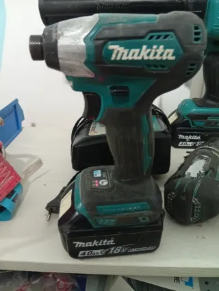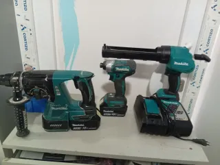 Set de herramientas eléctricas Makita a batería. - Taladro percutor. - Atornillador de impacto. - Pistola de silicona. - Cargador de batería.