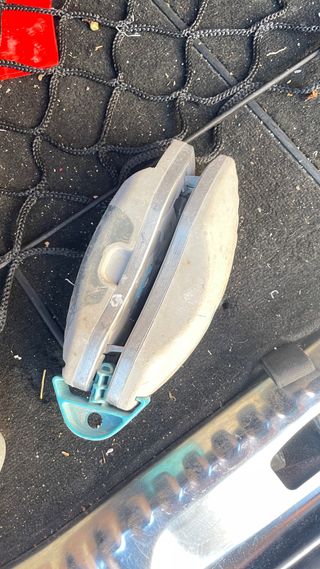 Se vende un mosquetón de metal con seguro y un gancho de hierro. - Mosquetón de metal con cierre de rosca. - Gancho de hierro con mecanismo de apertura y cierre.