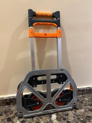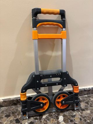 Carretilla plegable de carga con estructura metálica y detalles en naranja. - Mango ergonómico. - Ruedas resistentes para facilitar el transporte. - Diseño compacto y fácil de guardar. Esta en buen estado, solo se uso para una mudanza