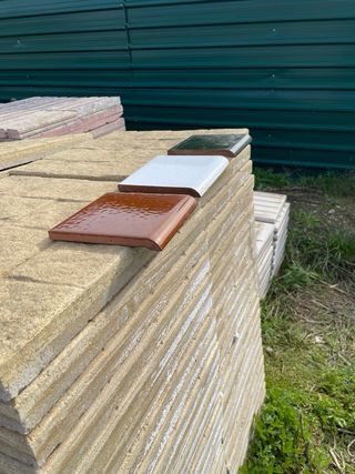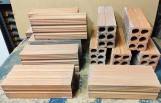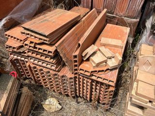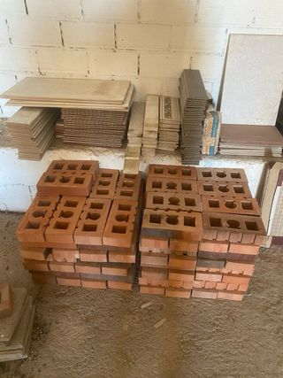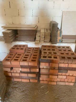 Material cerámico de construcción, de arcilla cocida. Nuevo, sin usar --- Ladrillo Tochana 6 huecos, 12 unidades a 0,20€ --- Ladrillo Gero, 3 unidades a 0,20€ --- Ladrillo Mahon 3 huecos, 4 unidades a 0,40€ --- Rasilla 14x28cm 10mm, 143 unidades a 0,40€ --- Rasilla 14x28cm 14mm, 38 unidades a 0,80€ --- Rasilla vierteaguas 14x31cm, 8 unidades a 1€ --- Compra mínima 10€ --- Precio del lote: 90€ --- Para recoger en Hospitalet de Llobregat.