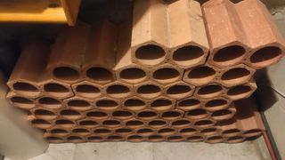 Ladrillos rústicos de terracota, ideales para construcciones o decoración. - Material: Terracota. - Diseño: Rústico. - Forma: Hexagonal con huecos. Total de ladrillos disponibles: 190 0,75€ unidad
