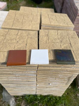 Ladrillos de gotera con acabado vidriado en medida de 14x14 cm. También están vidriados por debajo. Colores verde, blanco y caramelo.