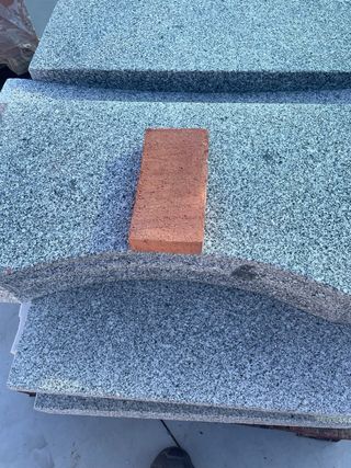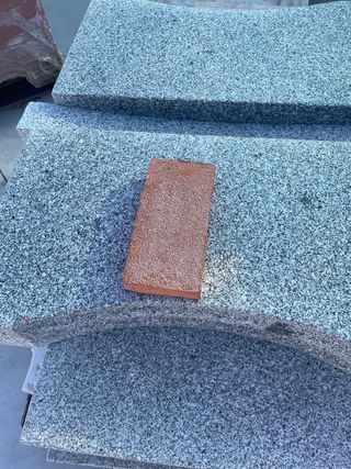 Lote variado de baldosas y adoquines de diferentes materiales y acabados. - Baldosas de granito gris y con motas. - Adoquines de ladrillo visto. - Materiales de construcción para exteriores.