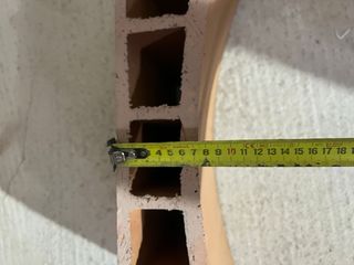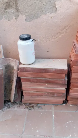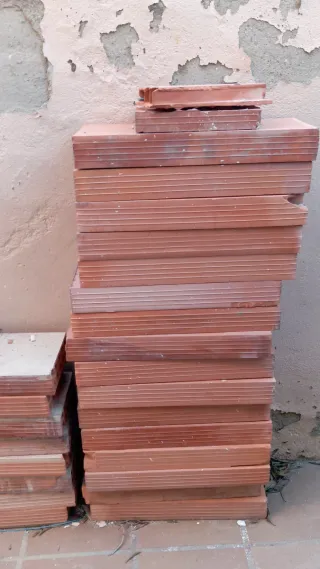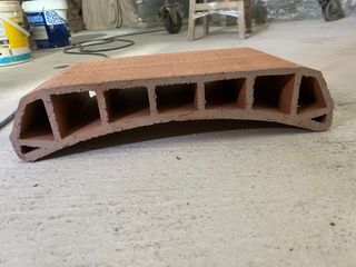 Ladrillo de terracota de color rojo liso. Hay unas 90 unidades. - Medidas: 60x25x12 cm. - Diseño con huecos interiores.