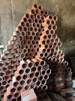 Más de 100 ladrillos botelleros con hueco para dos botellas. Facilísimo de apilar. 23cm de fondo para que entre la botella y 23'5cm de frontal los dos agujeros.