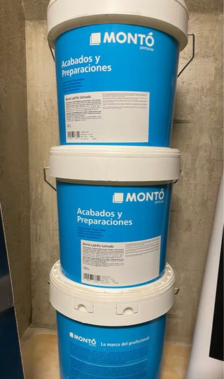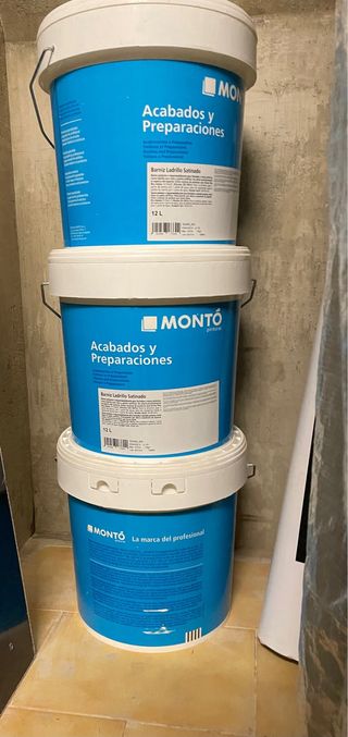 Lote de tres cubos de pintura Montó. - Acabados y Preparaciones. - Barniz Ladrillo Satinado. - Capacidad de 12 L cada uno.