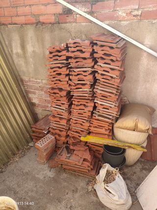 Lote de tejas de barro, perfectas para reparaciones o proyectos de construcción. - Material: Barro cocido. - Color: Rojo terracota. - Diseño: Curvas. - Cantidad: Varias unidades disponibles.