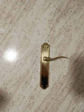 6 Juegos de manillas para puerta con acabado dorado (1 con condena para servicio) + 1 manilla a izquierdas troquelada para cerradura de entrada. - Placa alargada con forma. - Manilla curva.
