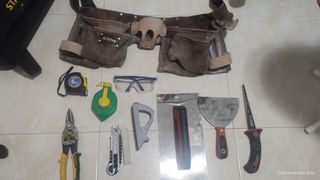 Conjunto de herramientas variadas, ideal para trabajos de fontanería y bricolaje. - Cortatubos de diferentes tamaños. - Llaves inglesas y fijas. - Alicates y tenazas. - Martillo. - Lima. - Herramienta para roscar tuberías.
