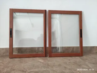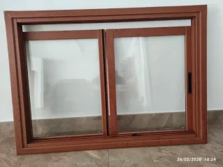Se venden ventanas de aluminio correderas con acabado en color madera. - Marco de aluminio resistente. - Cristal translúcido. - Tirador negro. - Medidas 90X68 - Marco 90X130