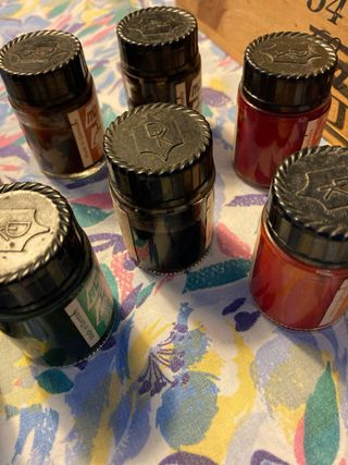 Se vende un set de 9 botes de laca de la marca PRAGER. Ideal para manualidades y aplicaciones artísticas. - Laca de colores variados. - Marca: PRAGER. - Ideal para bombillas, cristal y papel estaño. Se usa para dar color a envases de vidrio o crear efectos de vitral (falso vitral) Está formulada para aguantar el calor que generan las bombillas antiguas sin quemarse ni desprender olor inmediatamente