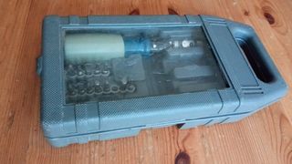Set de herramientas con mango de carraca y puntas. - Mango ergonómico con mecanismo de carraca. - Incluye diversas puntas para diferentes usos (faltan algunsa - Vasos de diferentes tamaños. El estuche no cierra hermético por haberse roto la pestaña