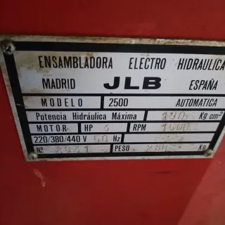 Máquina ensambladora JLB Electro Hidráulica fabricada en España. - Modelo: 2500 - Potencia Hidráulica Máxima: 190 Kg cm² - Motor: 3 HP, 50 Hz - Voltaje: 220/380/440 V - RPM: 1500 - Número de serie: 2031 - Peso: 280 Kg