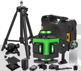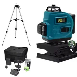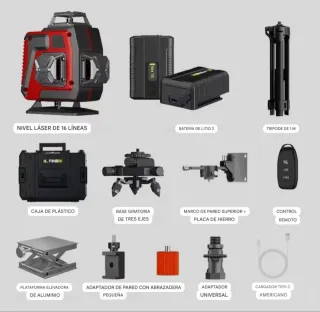 Este nivel láser autonivelante es una herramienta versátil para tus proyectos. de construcción 4D con 16 líneas láser, modo de pulso para exteriores - Incluye nivel láser 360° X 4. - Viene con trípode. - Incluye dos baterías de litio. - Se acompaña de accesorios para su uso. - autonivelación, soporte rotativo, control remoto.