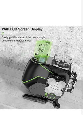 Nivel láser 4D con 16 líneas verdes autonivelante, display digital indicador nivel de bateria, horizontal y vertical 360° ideal para trabajos de construcción y decoración. Incluye todos los accesorios necesarios para su uso. -Incluye trípode, base giratoria, plataforma y soporte de pared. -2 Baterías recargables y cargador. -Incluye mando a distancia. -Incluye maletín de transporte en tela para nivel y accesorios. El trípode lleva su propia bolsa.