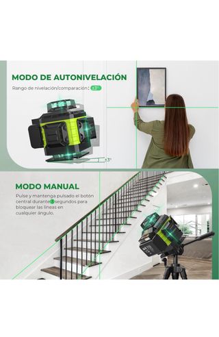 produce 16 líneas láser (8 horizontales, 8 verticales) 4D de 360° genera 2 haces de 360º. ofreciendo una visibilidad 4 veces mayor que los haces rojos precisión de +-1/10 de pulgada a 2.5 metros (8 pies) y un alcance máximo de trabajo de 30 metros (100 pies). El brillo es ajustable del 1% al 100% Cumple con el estándar de seguridad Clase II (potencia de salida <1mW) Cuando el ángulo de inclinación es 3°, el láser se nivela automáticamente presionado el botón "EXTERIOR" durante 3 segundos para activar el modo manual Incluye 2 baterías recargables, proporcionando hasta 8 horas de trabajo continuo