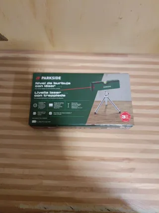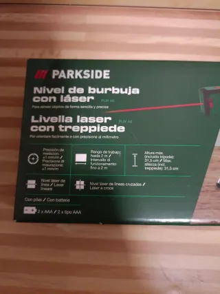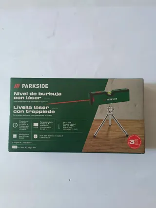 Nivel láser de burbuja de la marca Parkside, con trípode incluido. Nuevo precintado en su caja - Incluye 2 pilas AAA. - Láser de líneas cruzadas.